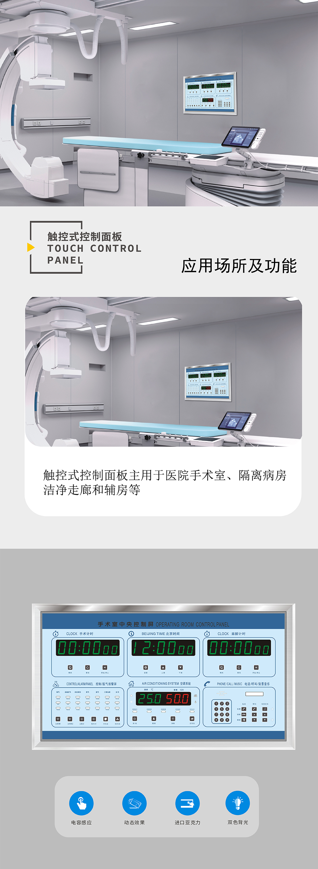 觸控式控制面板主用于醫院手術(shù)室、隔離病房、潔凈走廊和輔房等,可實(shí)現各種北京時(shí)間、手術(shù)計時(shí)、麻醉計時(shí)、溫濕度設定及顯示、遠程開(kāi)關(guān)機、醫氣報警、隔離/1T電源、電話(huà)/群呼、呼 叫對講、廣播和背景音樂(lè )等功能。