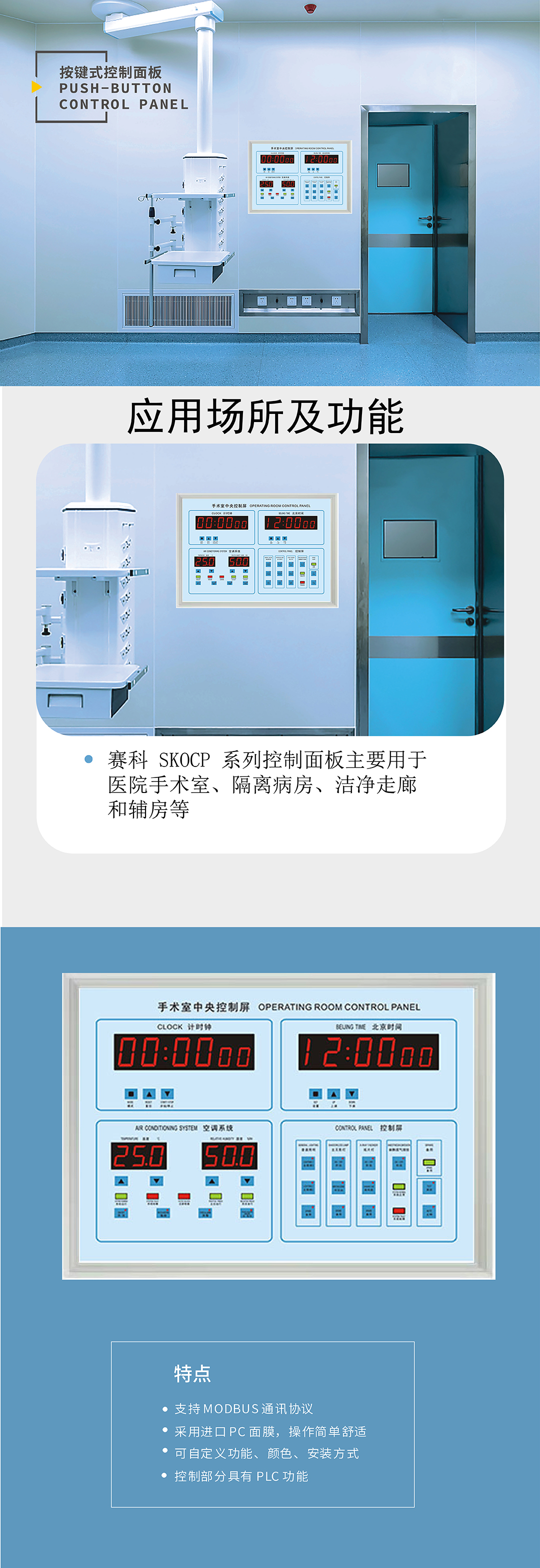 應用場(chǎng)所及其功能:賽科 SKOCP 系列控制面板主要用于醫院手術(shù)室、隔離病房、潔凈走廊和輔房等,可實(shí)現各種北京時(shí)間、手術(shù)計時(shí)、麻醉計時(shí)、溫濕度設定及顯示、遠程開(kāi)關(guān)機、醫氣報警、隔離/IT電源、電話(huà)/群呼、呼叫對講、廣播和背景音樂(lè )等功能。
